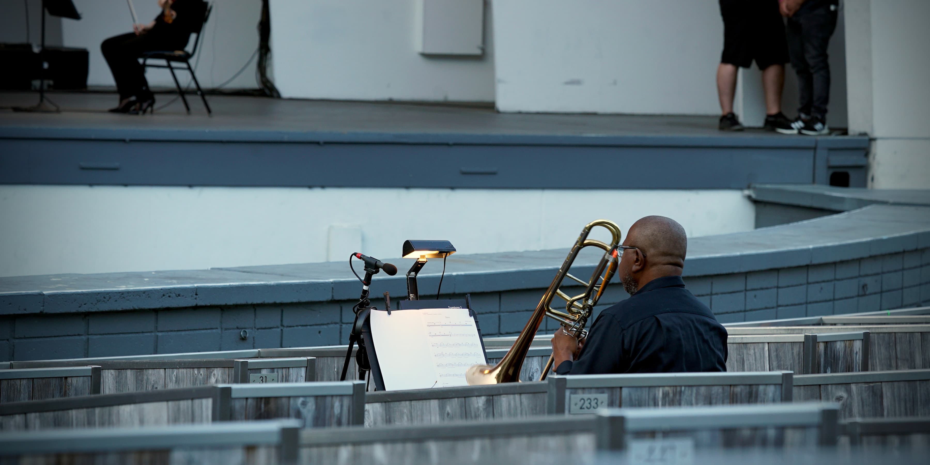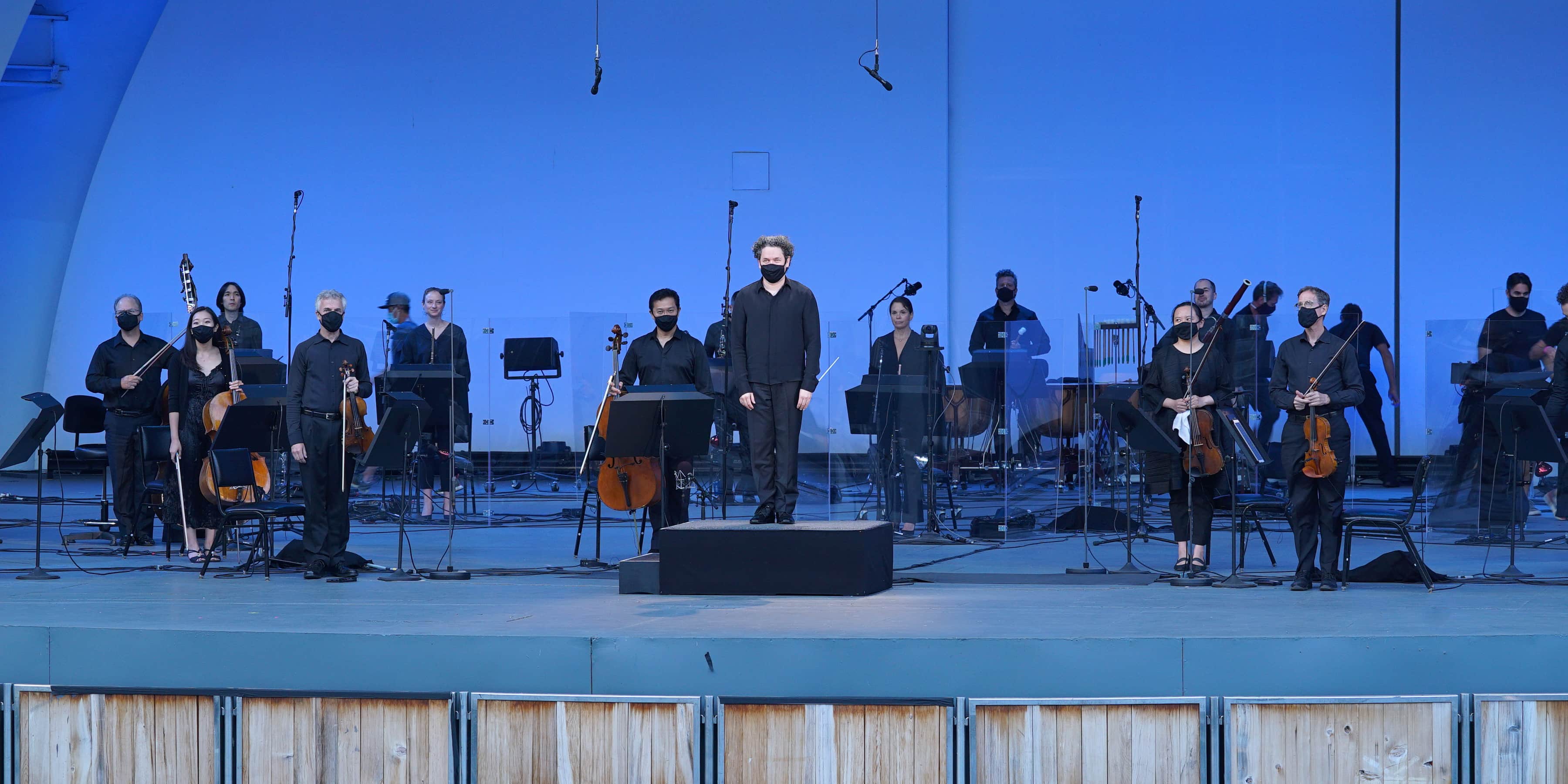 Para Dawn de Thomas Adès, la orquesta requerida era demasiado grande para caber en el escenario. El compositor apoyó plenamente la idea de honrar la distancia social con la que vivimos en el estreno estadounidense de esta nueva pieza, y la sección de metales se colocó en la primera fila de palcos.
