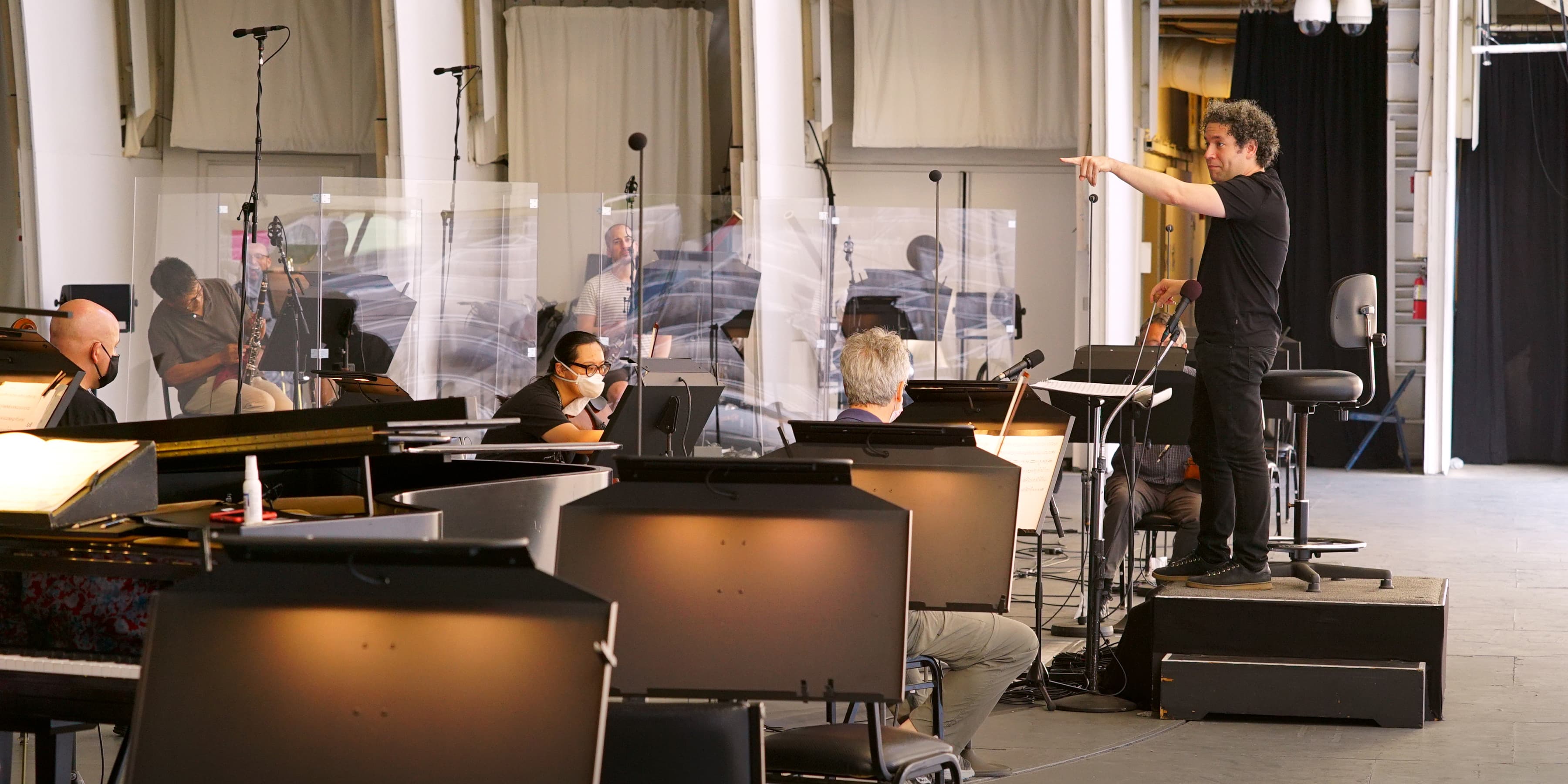 Para permitir las señales faciales que son propias del estilo de dirección de Gustavo Dudamel, lo colocaron más lejos de los músicos frontales más cercanos a él para poder quitarse la máscara.