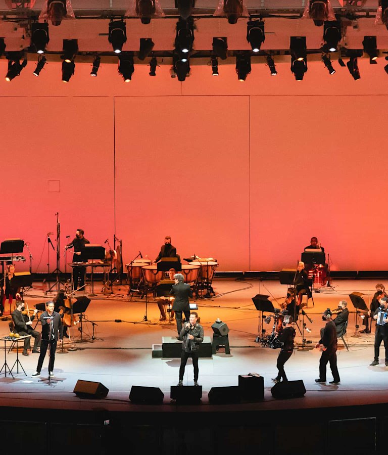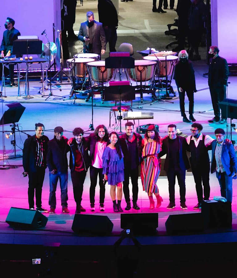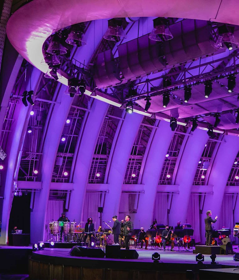 Carlos Vives and his band on stage at the Hollywood Bowl with the LA Phil